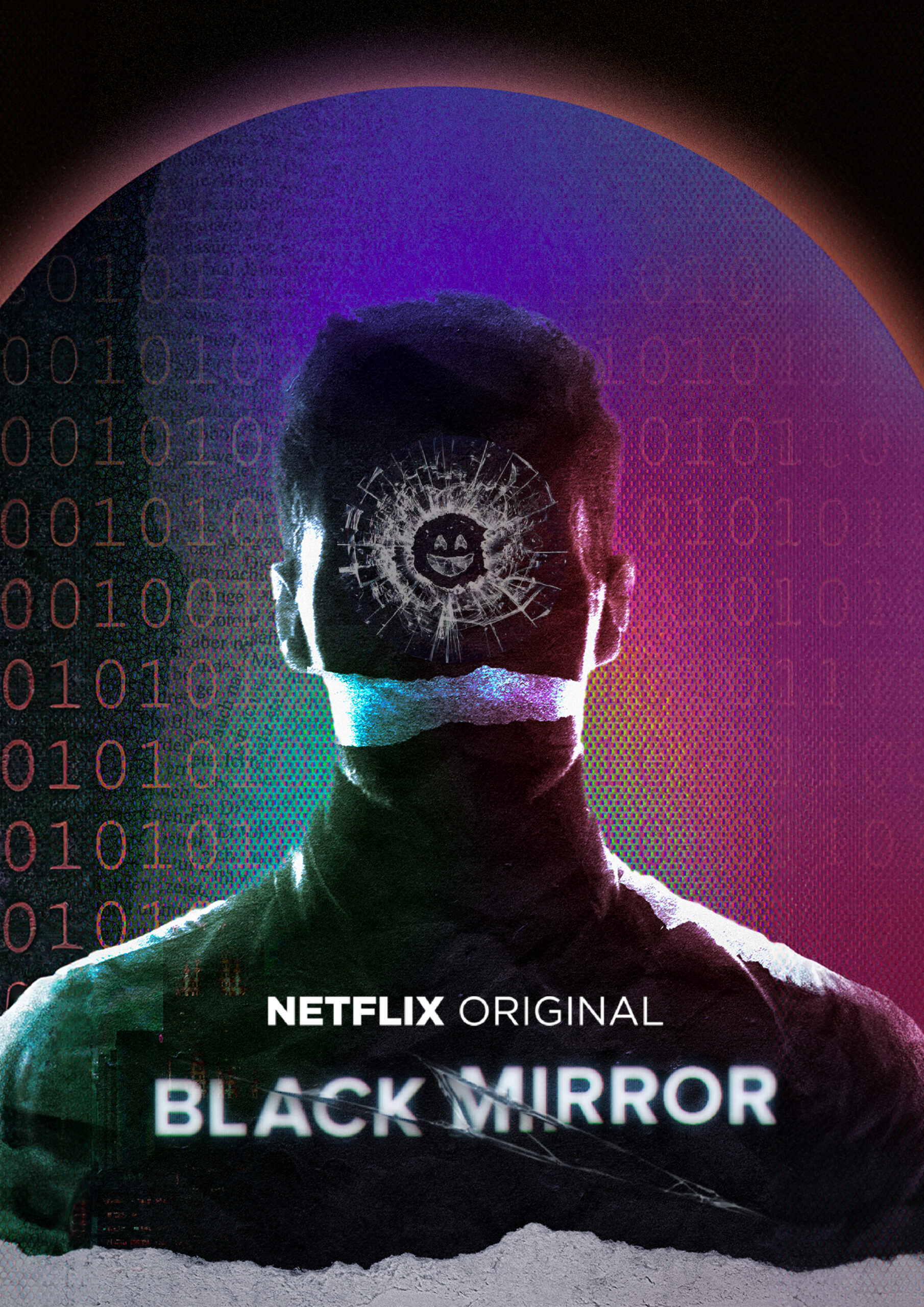 Fotomontaje realizado en Adobe Photoshop. Poster conceptual inspirado en Black Mirror, explorando la relación entre tecnología e identidad mediante una estética digital, códigos binarios y una atmósfera distópica.